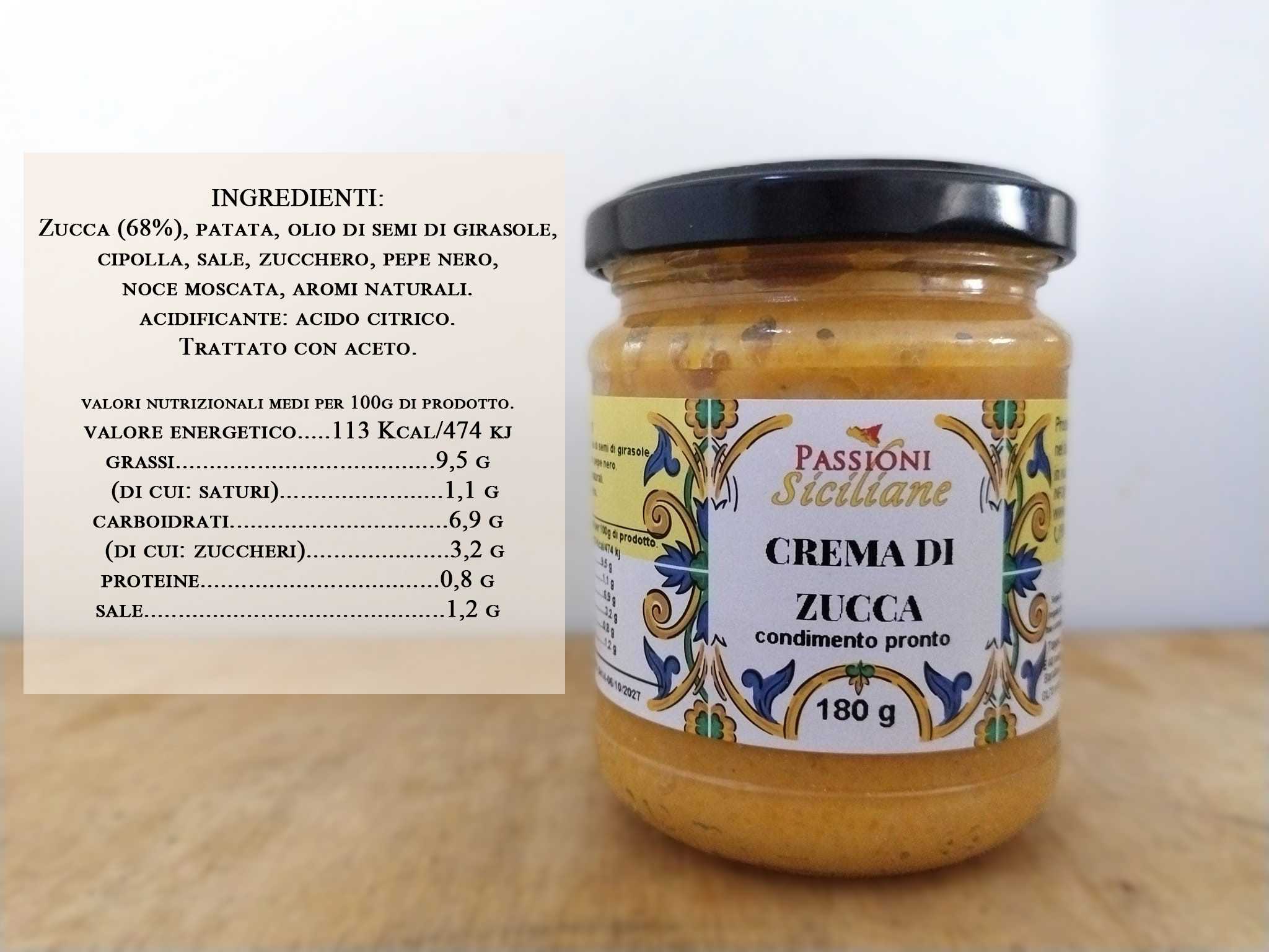 • Crema di Zucca 180 g – una crema salata morbida e profumata, realizzata con zucca siciliana e spezie mediterranee. Ottima come condimento per primi piatti o come base per contorni.